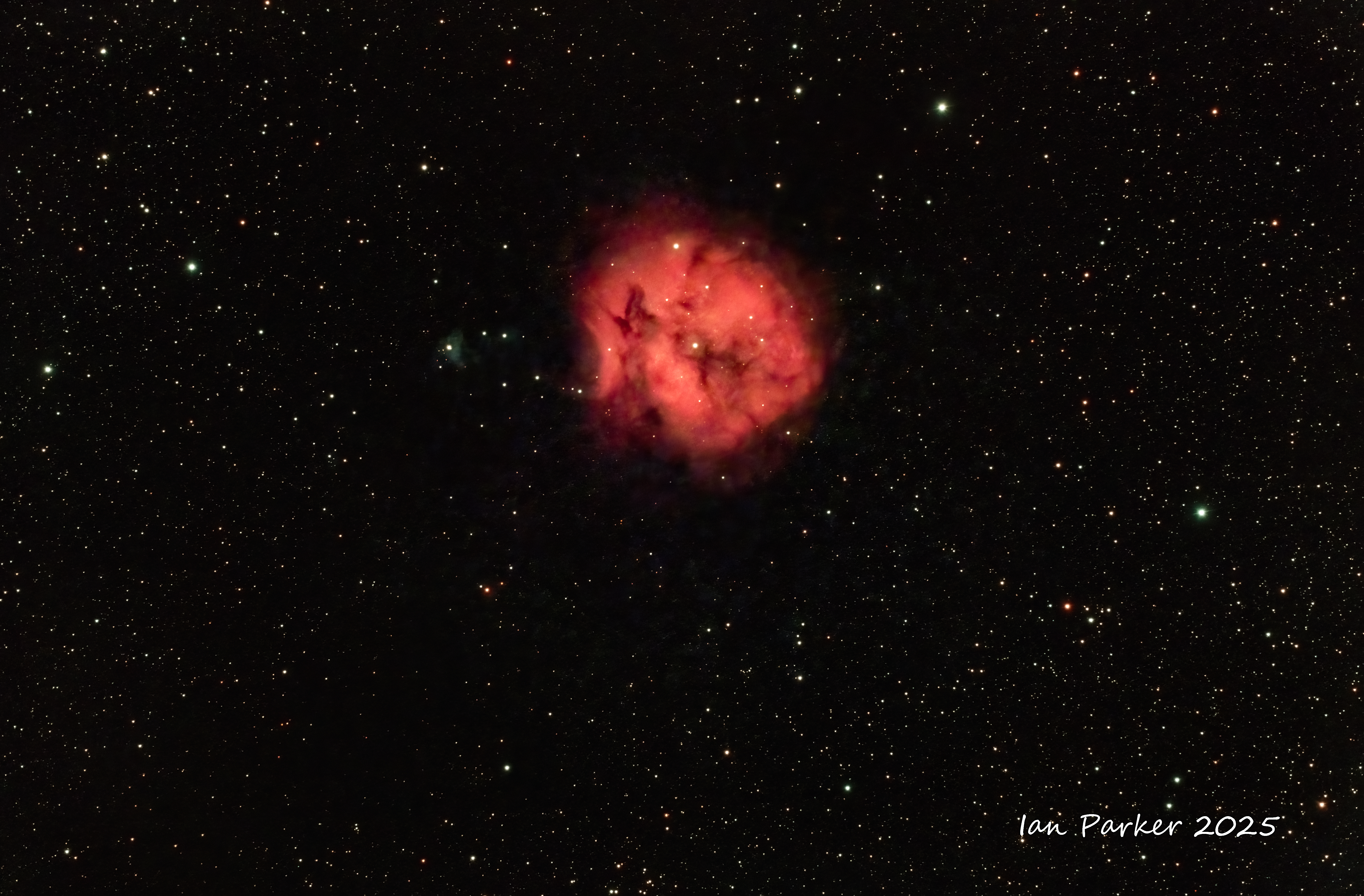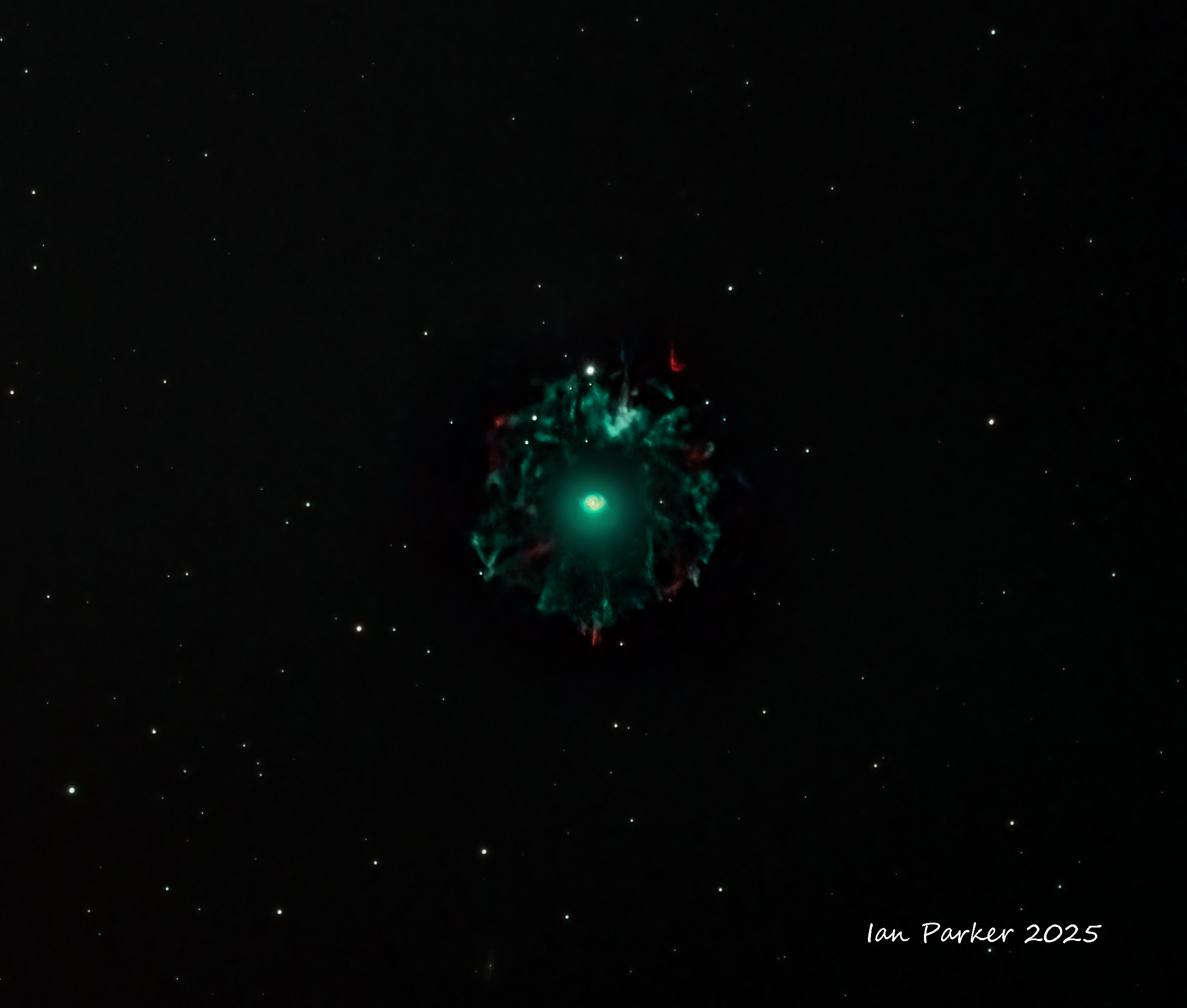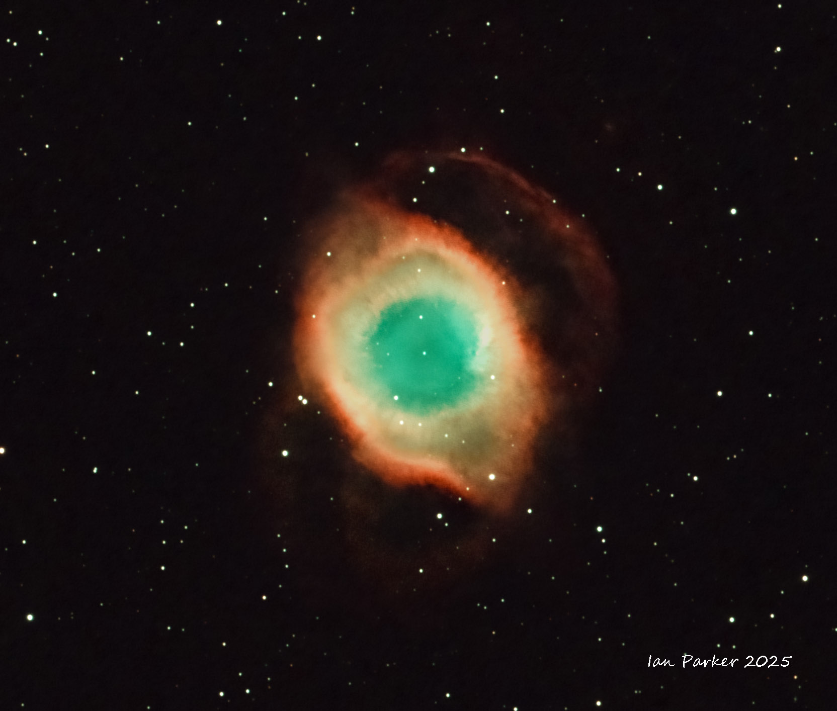 The Helix Nebula (NGC 7293) is a planetary nebula in the constellation Aquarius. Of all of the known planetary nebulae in the night sky, the Helix Nebula is one of the brightest, and closest to Earth. Planetary nebulae are created when a star (similar to our own Sun) nears the end of its life. They are formed when the star sheds its outer layers near the end of its evolution and expells the gases into space. The remnant stellar core (the planetary nebula nucleus) will eventually become a white dwarf star. In the meantime (tens of thousands of years - a fleeting instant on the cosmic scale) the glow of the central star is so energetic that it causes the previously expelled gases (primarily ionized Hydrogen (red) and oxygen (teal) to brightly fluoresce.
