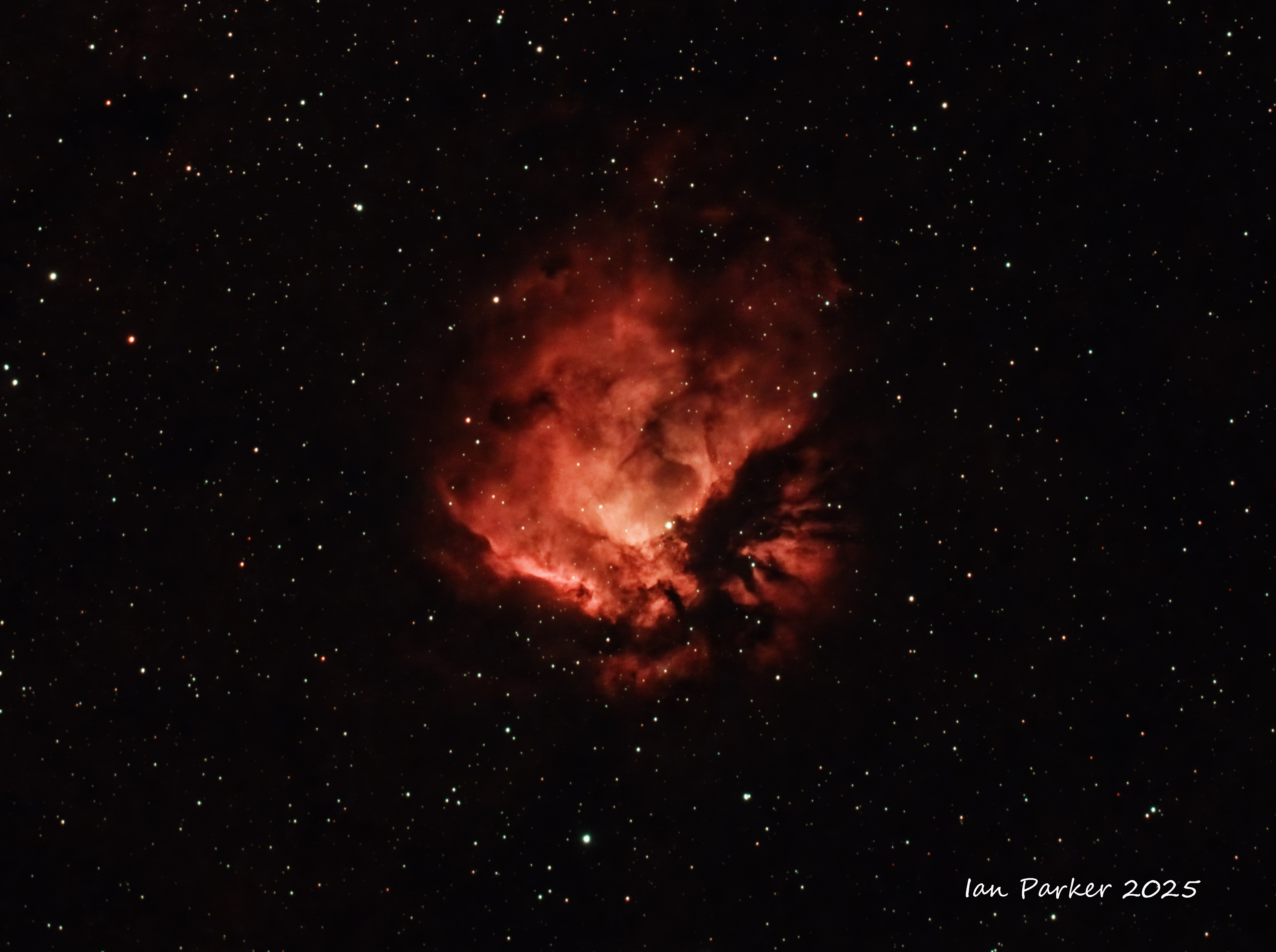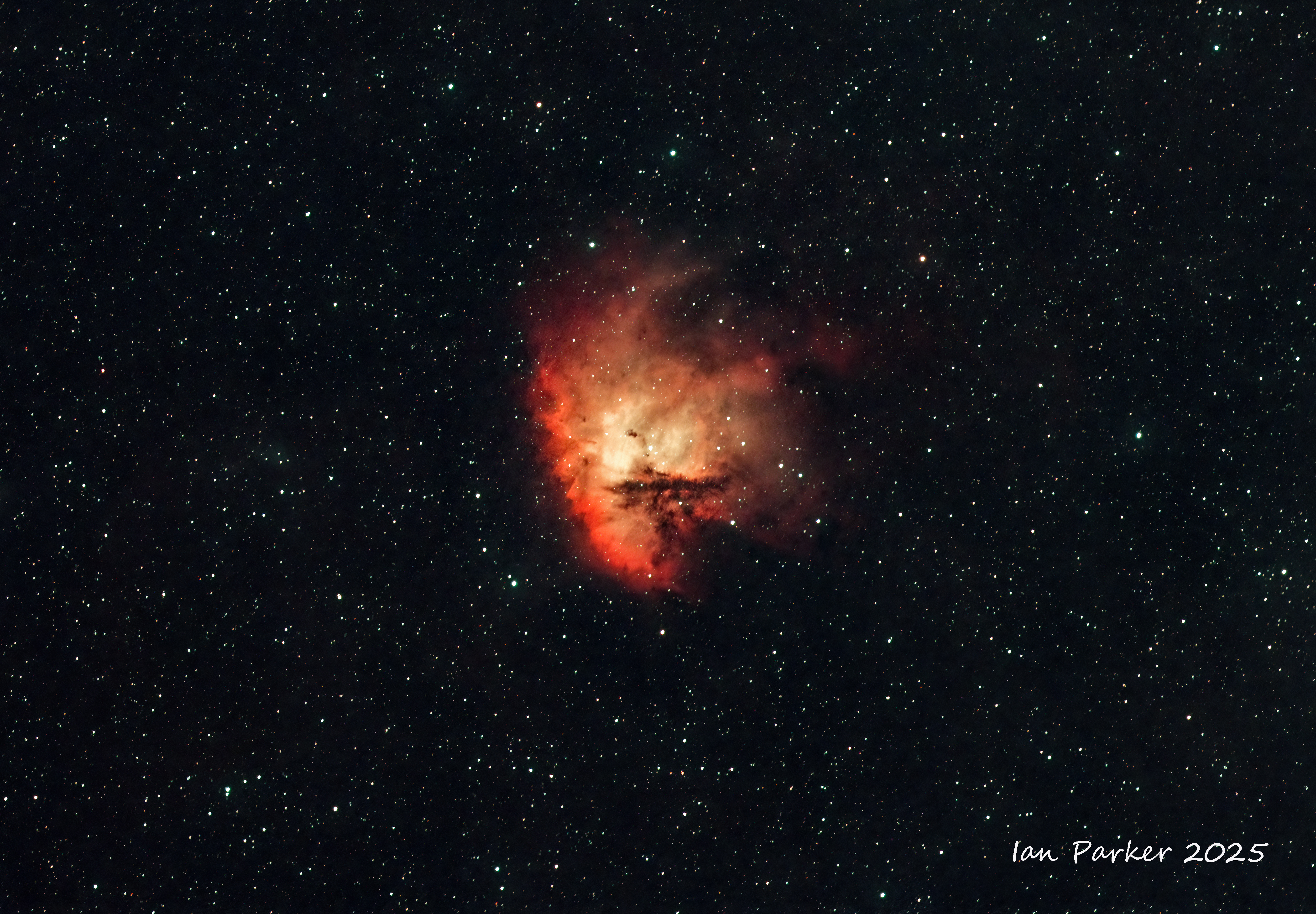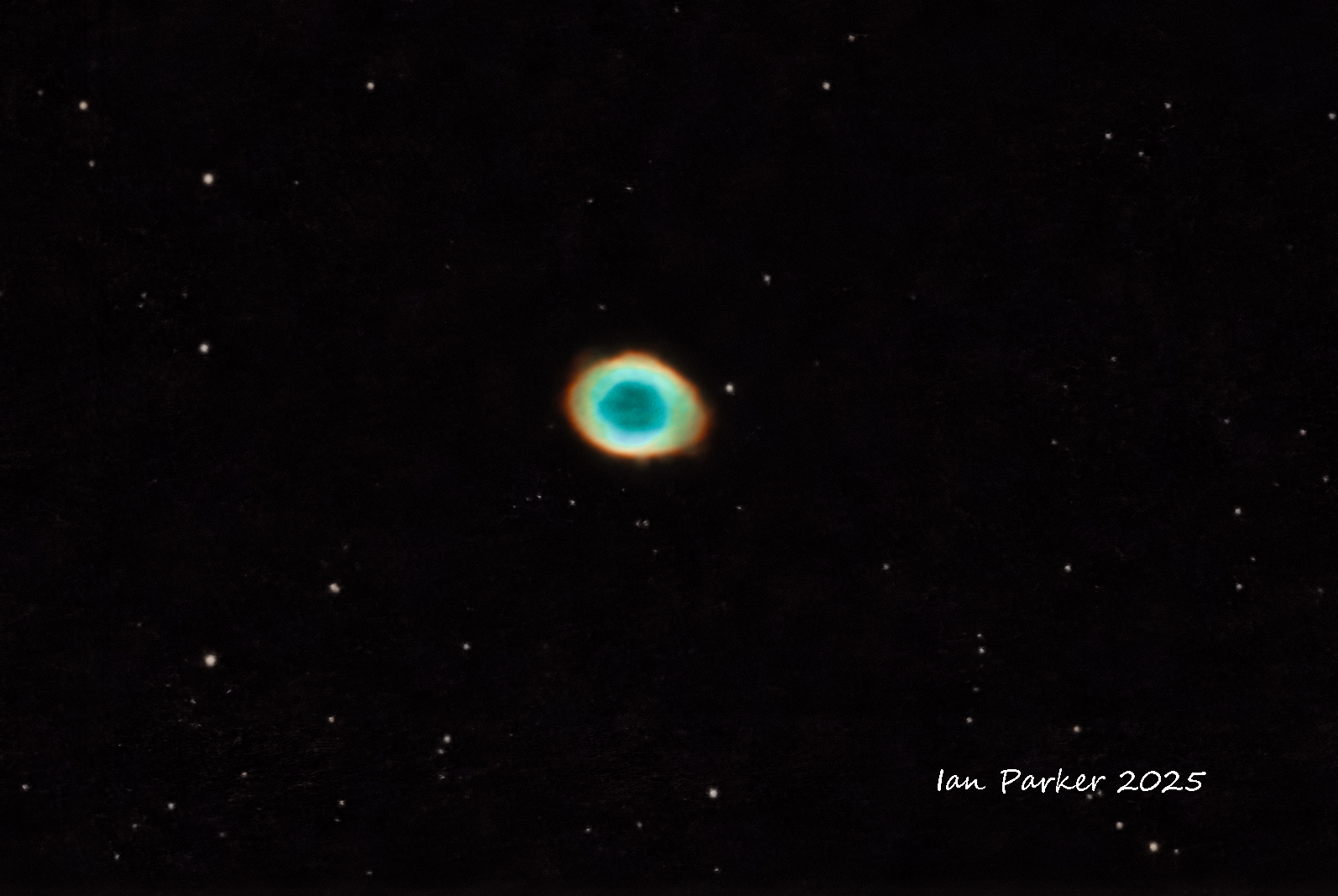 The Helix Nebula (NGC 7293) is a planetary nebula in the constellation Aquarius. Of all of the known planetary nebulae in the night sky, the Helix Nebula is one of the brightest, and closest to Earth. Planetary nebulae are created when a star (similar to our own Sun) nears the end of its life. They are formed when the star sheds its outer layers near the end of its evolution and expells the gases into space. The remnant stellar core (the planetary nebula nucleus) will eventually become a white dwarf star. In the meantime (tens of thousands of years - a fleeting instant on the cosmic scale) the glow of the central star is so energetic that it causes the previously expelled gases (primarily ionized Hydrogen (red) and oxygen (teal) to brightly fluoresce.