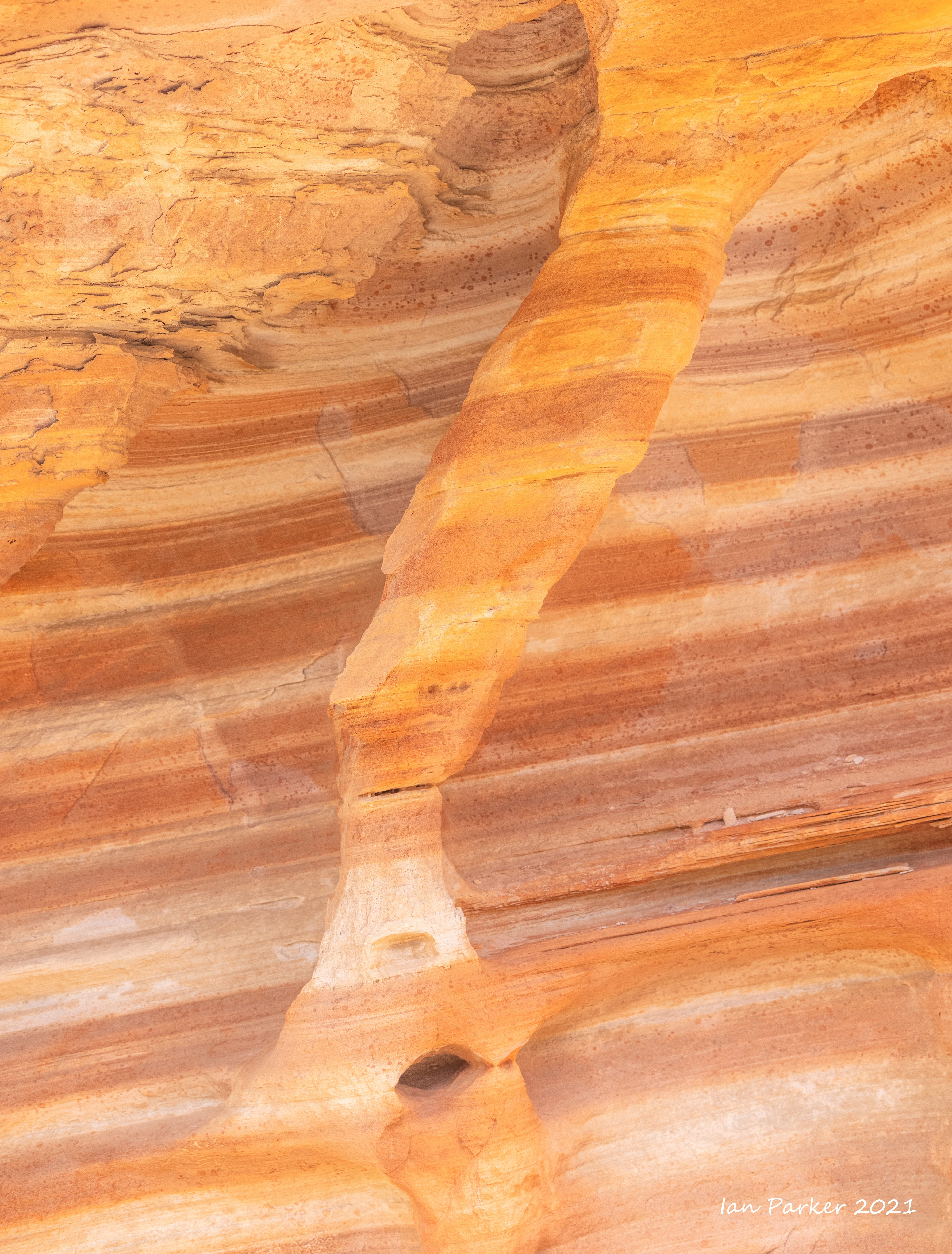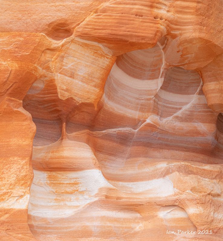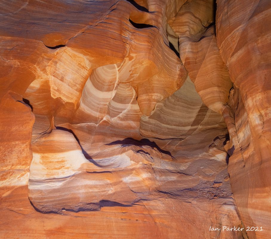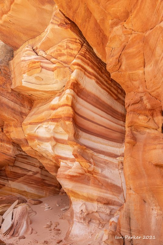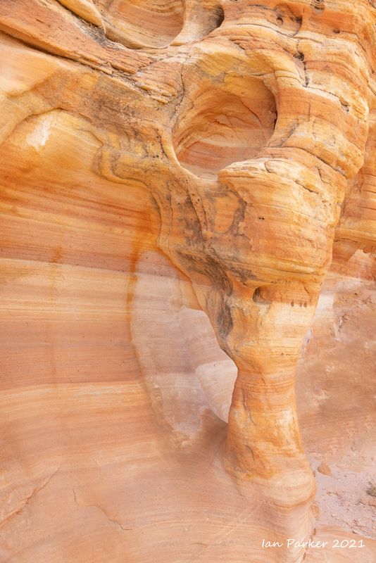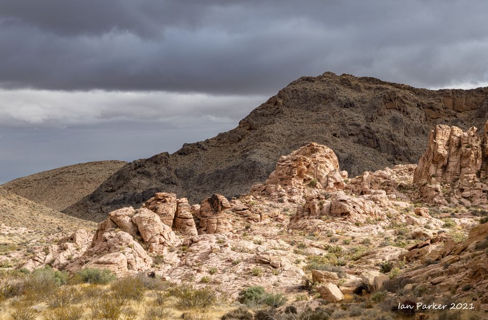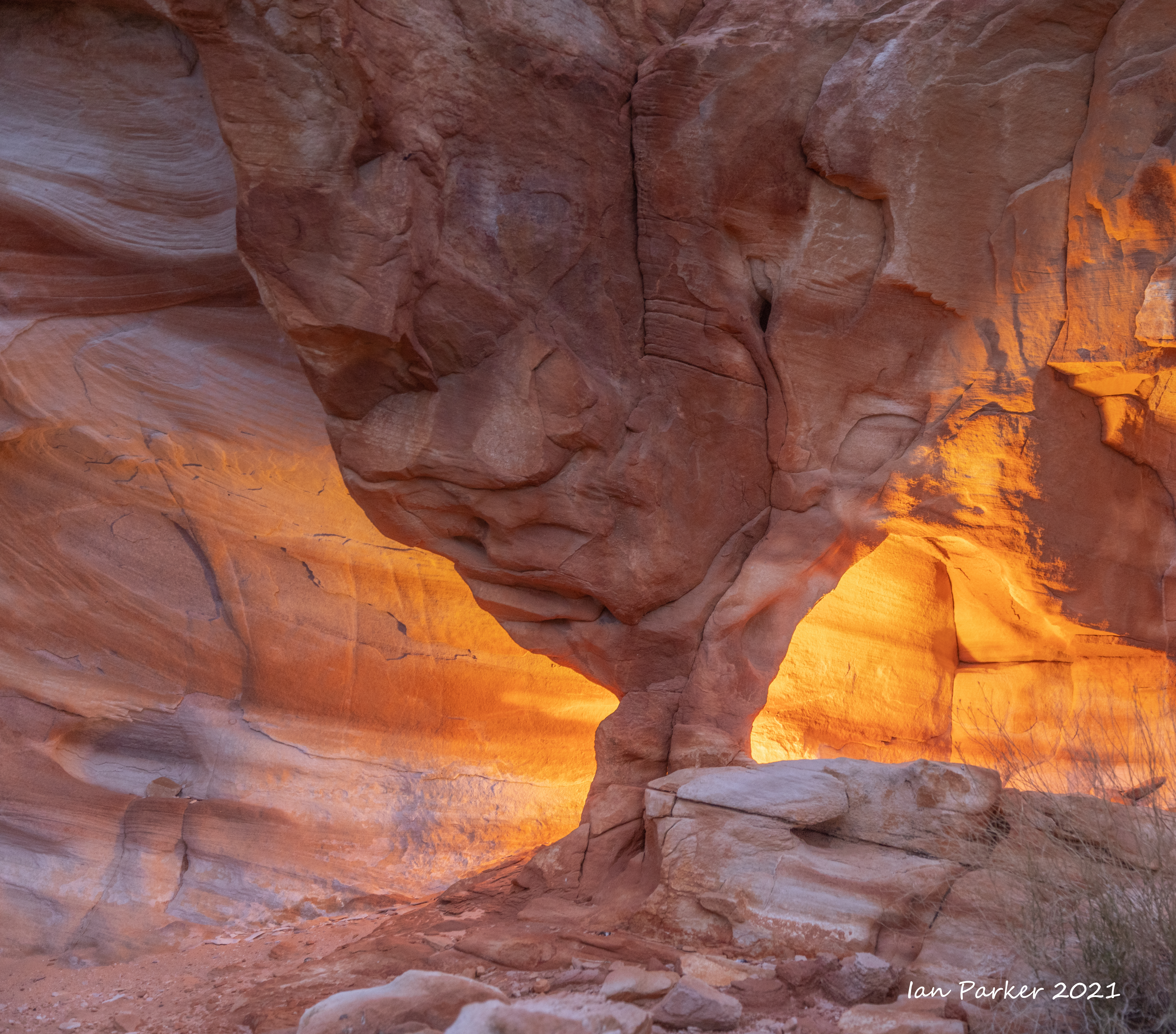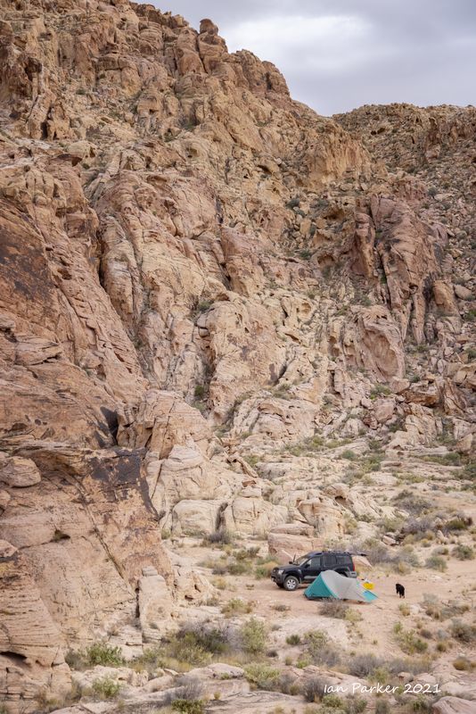 Now fully immunized, Anne and I escaped from covid home-isolation for a long-weekend camping trip. Our destination was Buffington Pockets, a remote backcountry area about 50 miles past Las Vegas. I had not previously visited, but I was attracted by photos on the internet (here and here) illustrating intriguing sandstone features and colors. The pockets lie within the Muddy Mountains, a range of grey limestone peaks interspersed by enormous outcroppings of fossilized sand dunes. The sandstone is part of the same Aztec formation as at the nearby Valley of Fire state park and, although not quite as spectacular as the popular Valley of Fire, a great attraction for us was the remarkably low level of visitation. We encountered only two other people over three days and, found some wonderful camping sites.