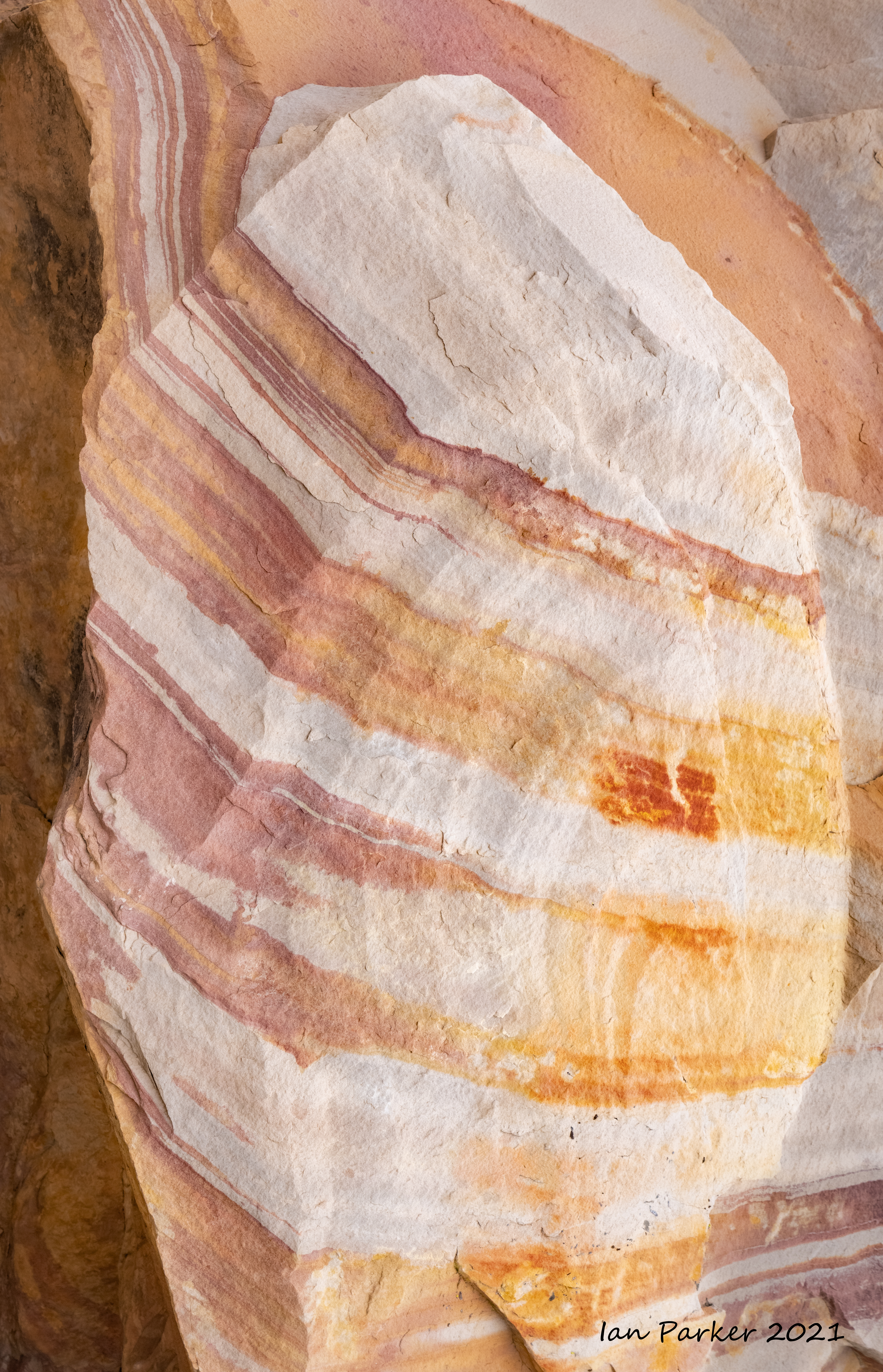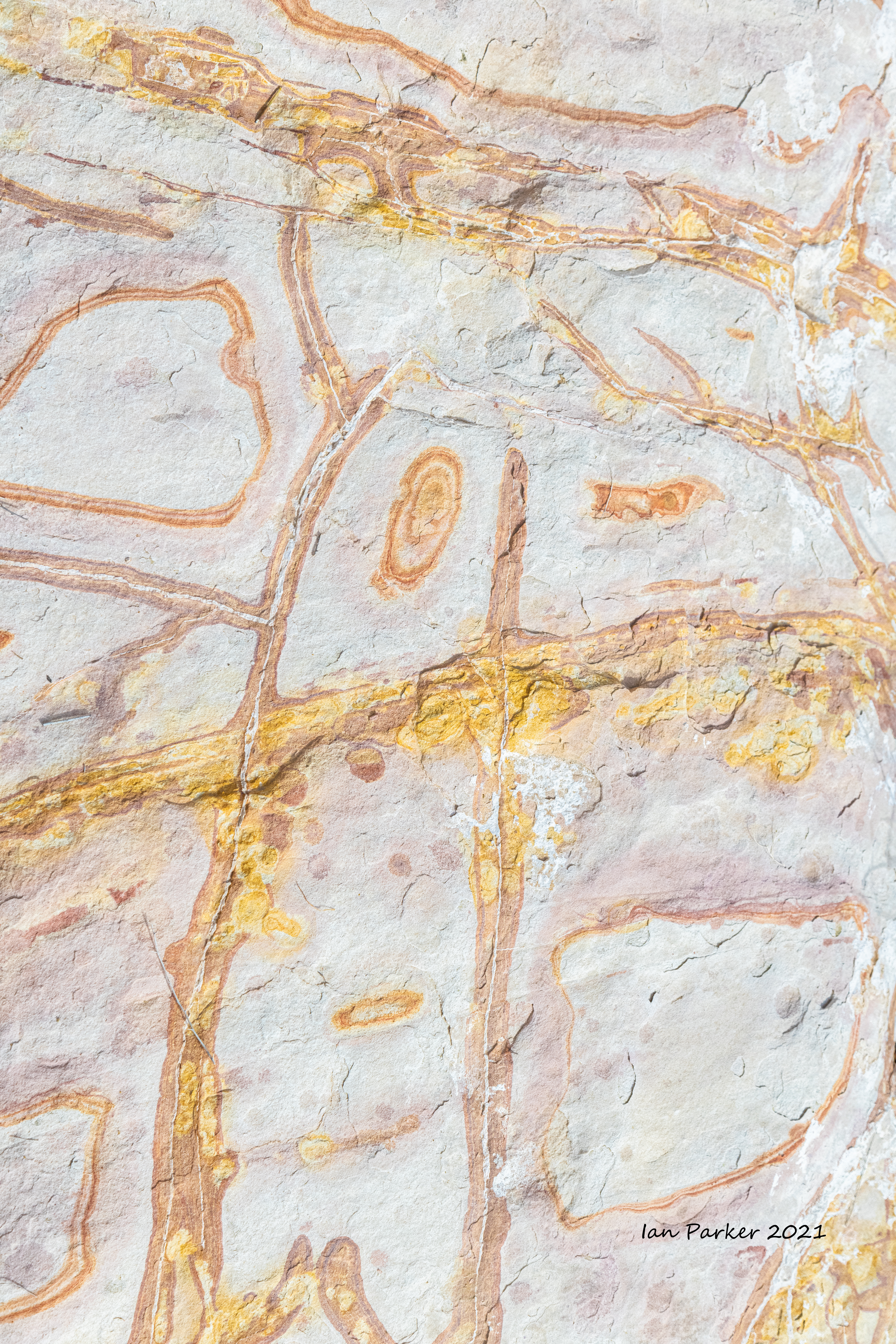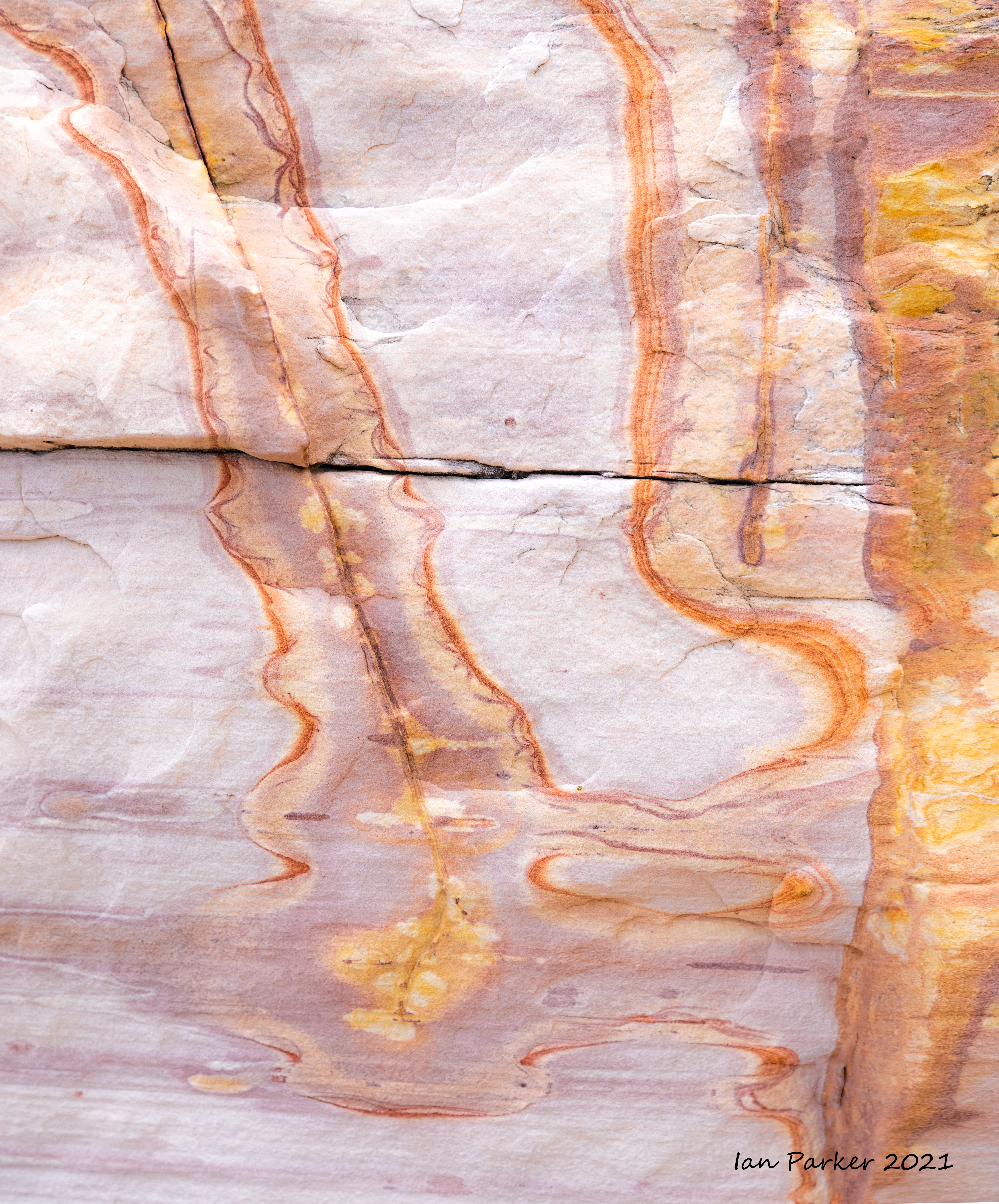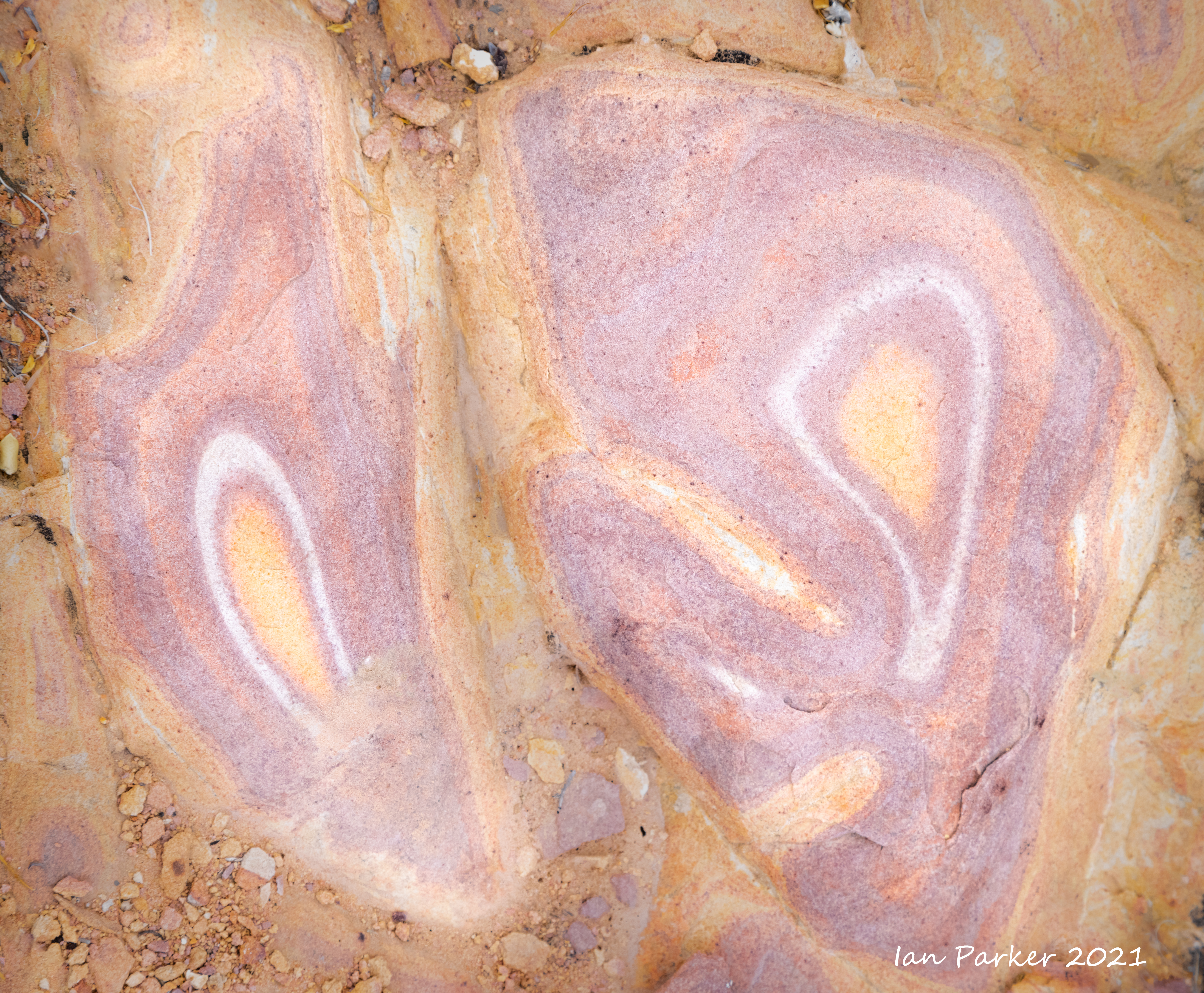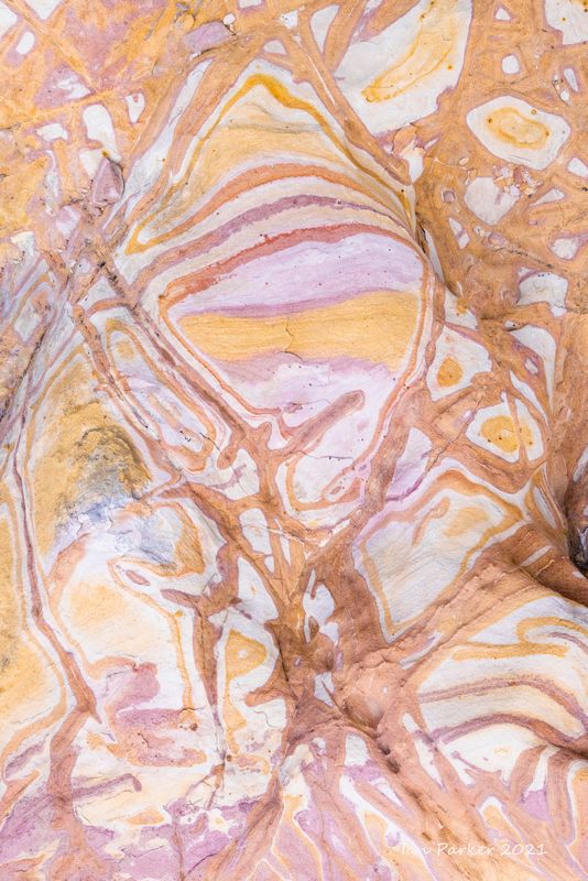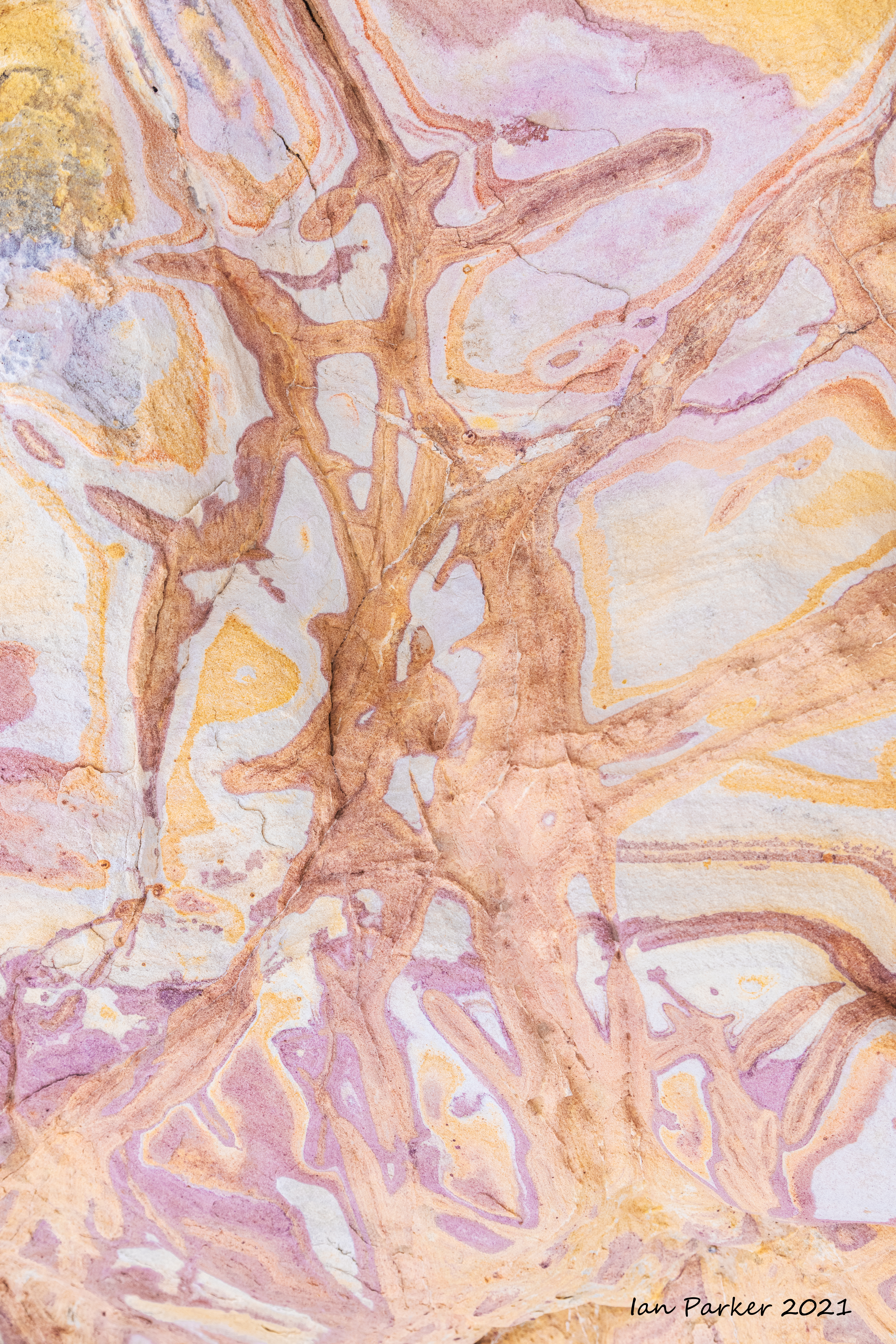 We drove along the rough Bitter Springs OHV trail through the mountains, passing through Buffington Pockets, and explored several side trails heading off into canyons and giving access to other sandstone areas with features that very surprisingly between the different outcrops. We first visited the north east area, where the rock is pockmarked by vast numbers of little caves and hollows, featuring many small arches. My favorite, though, was Color Rock Quarry which, as the name suggests, was the site of a small-scale quarrying operation. Unlike the deep red sandstone of the other canyons, the rock here is lighter in shade, often even white, but intricately striped with sinuous bands of pastel colors from yellow to purple. Little remains of the quarrying operation beyond a spectacularly graffitied hut, but along the track at the base of the quarried face several flat rock panels are exposed, displaying the colored striations to best effect.