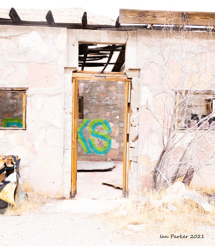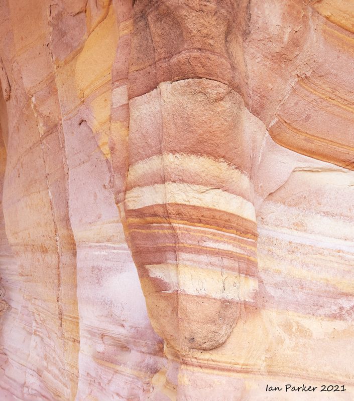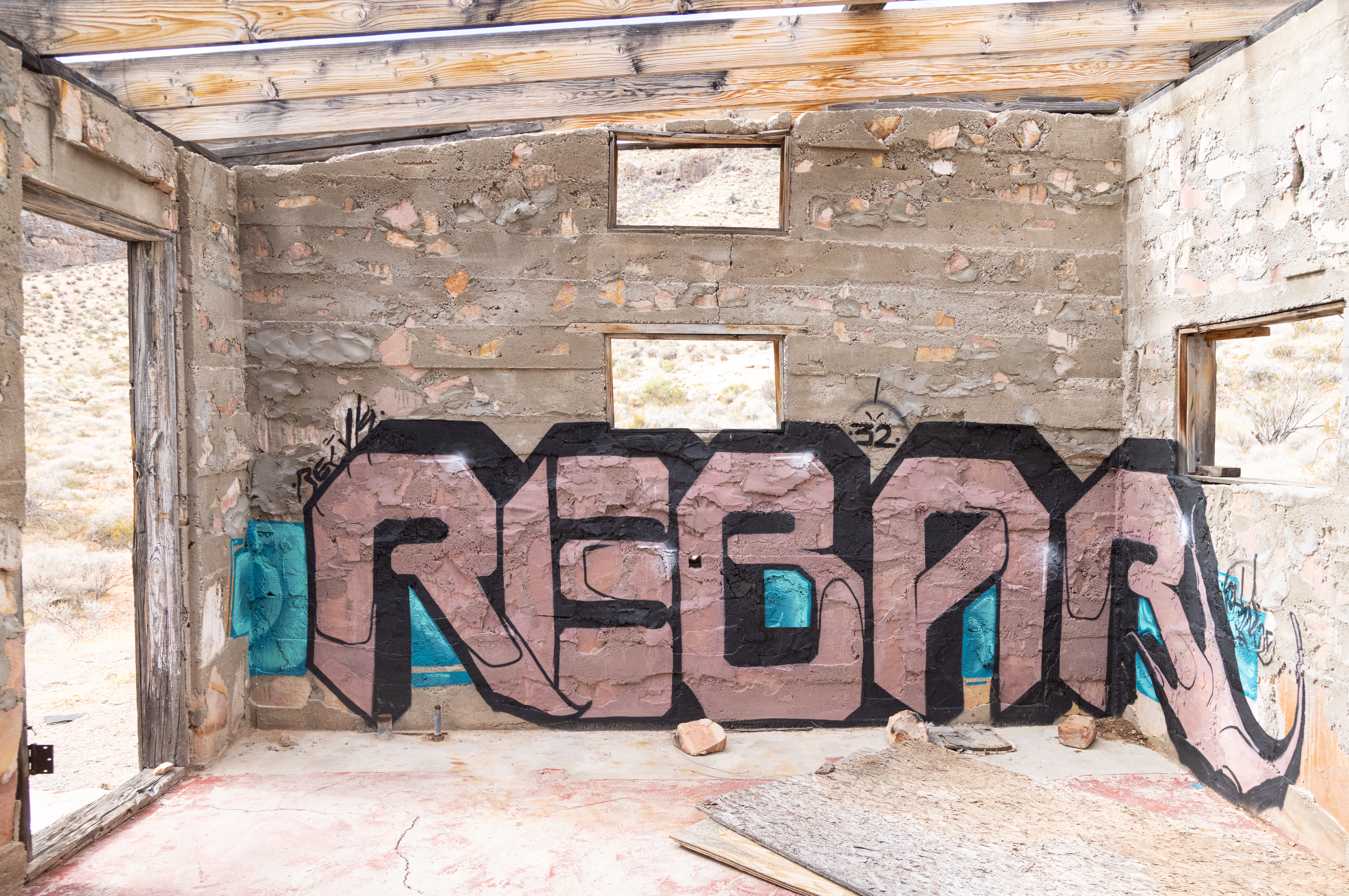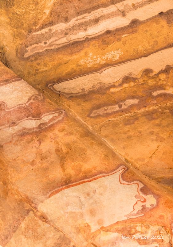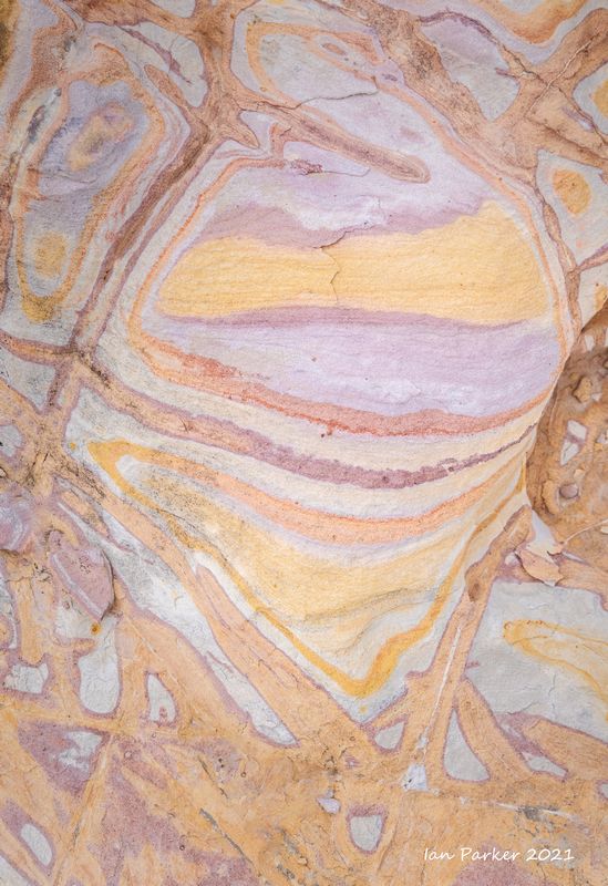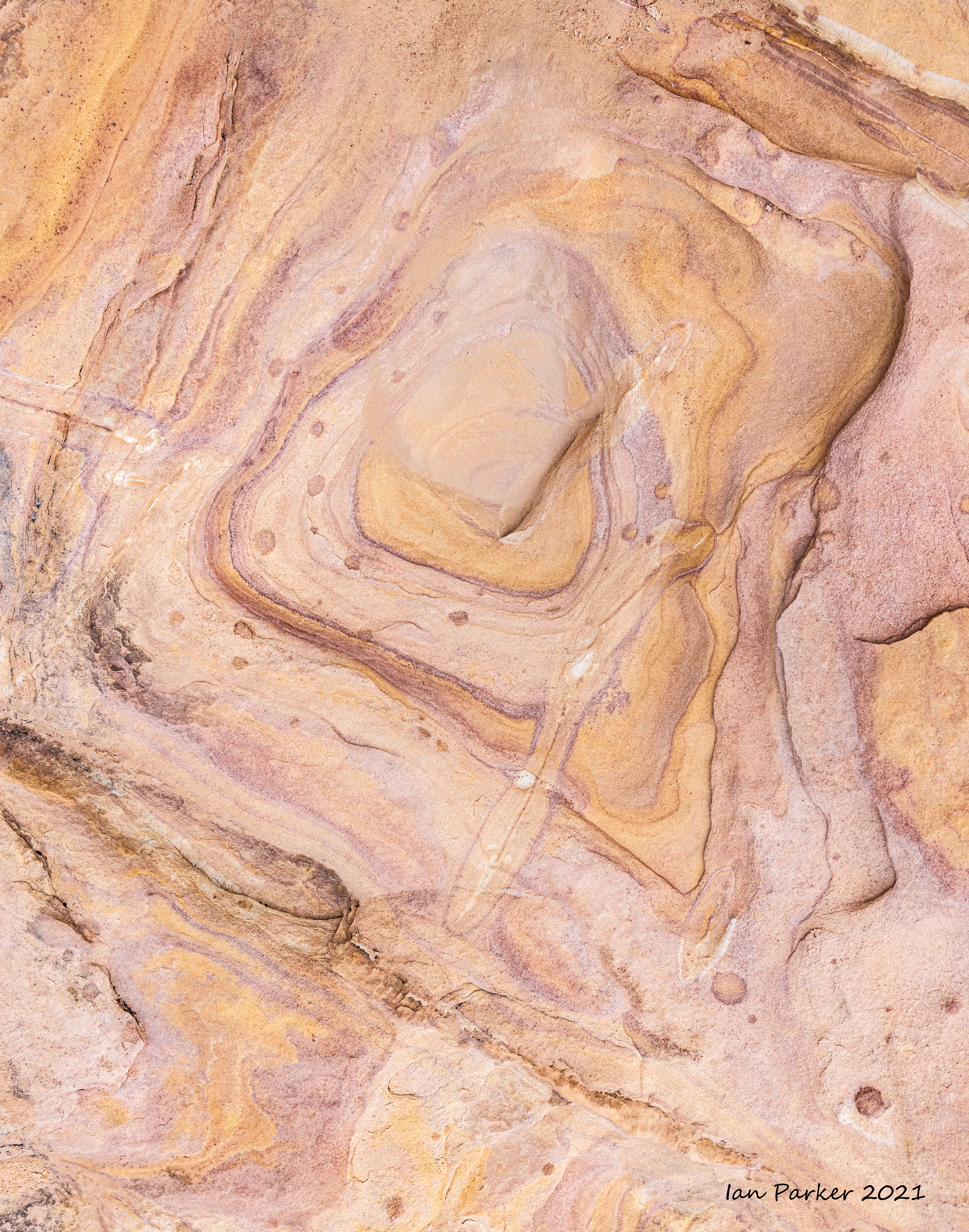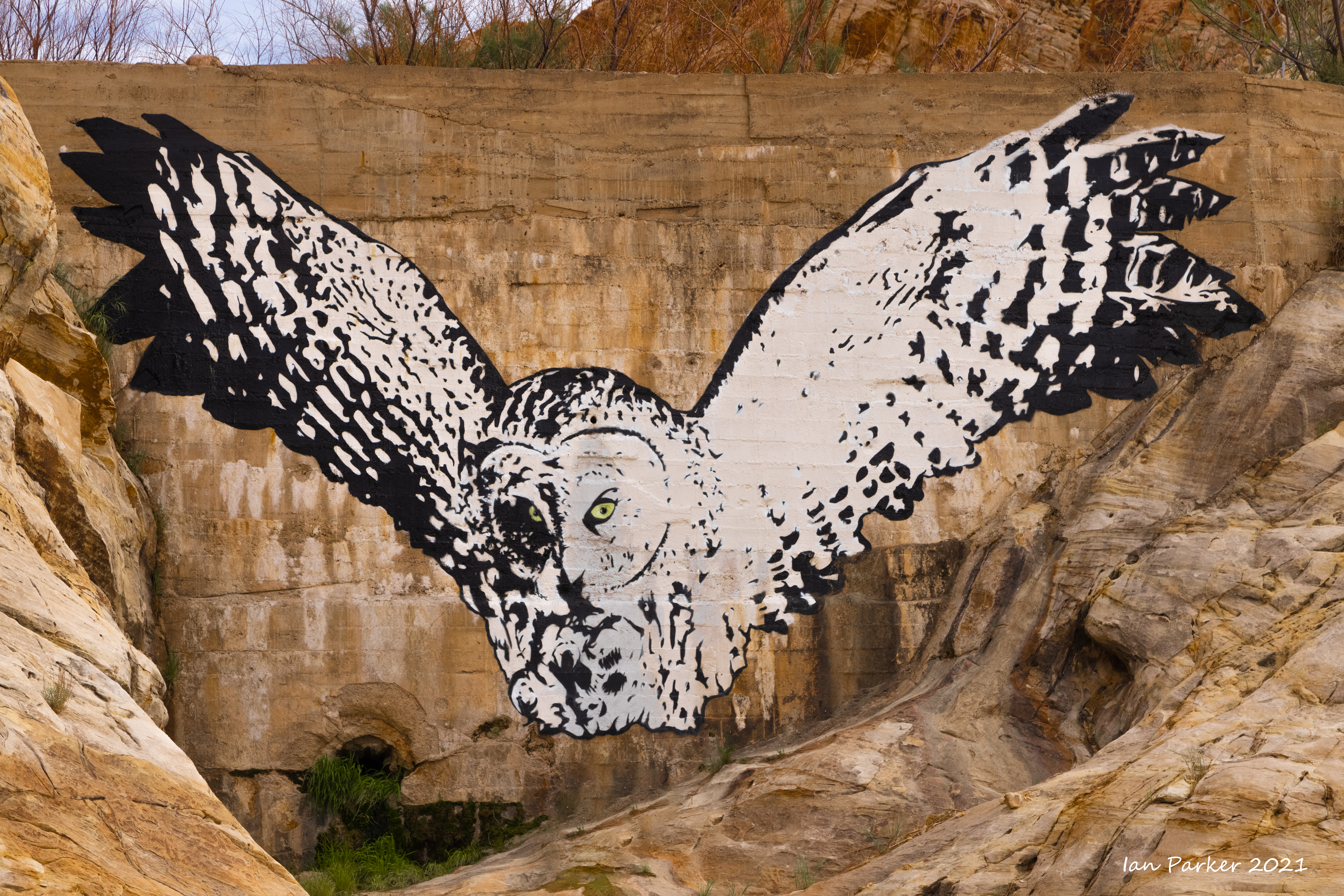 We drove along the rough Bitter Springs OHV trail through the mountains, passing through Buffington Pockets, and explored several side trails heading off into canyons and giving access to other sandstone areas with features that very surprisingly between the different outcrops. We first visited the north east area, where the rock is pockmarked by vast numbers of little caves and hollows, featuring many small arches. My favorite, though, was Color Rock Quarry which, as the name suggests, was the site of a small-scale quarrying operation. Unlike the deep red sandstone of the other canyons, the rock here is lighter in shade, often even white, but intricately striped with sinuous bands of pastel colors from yellow to purple. Little remains of the quarrying operation beyond a spectacularly graffitied hut, but along the track at the base of the quarried face several flat rock panels are exposed, displaying the colored striations to best effect.