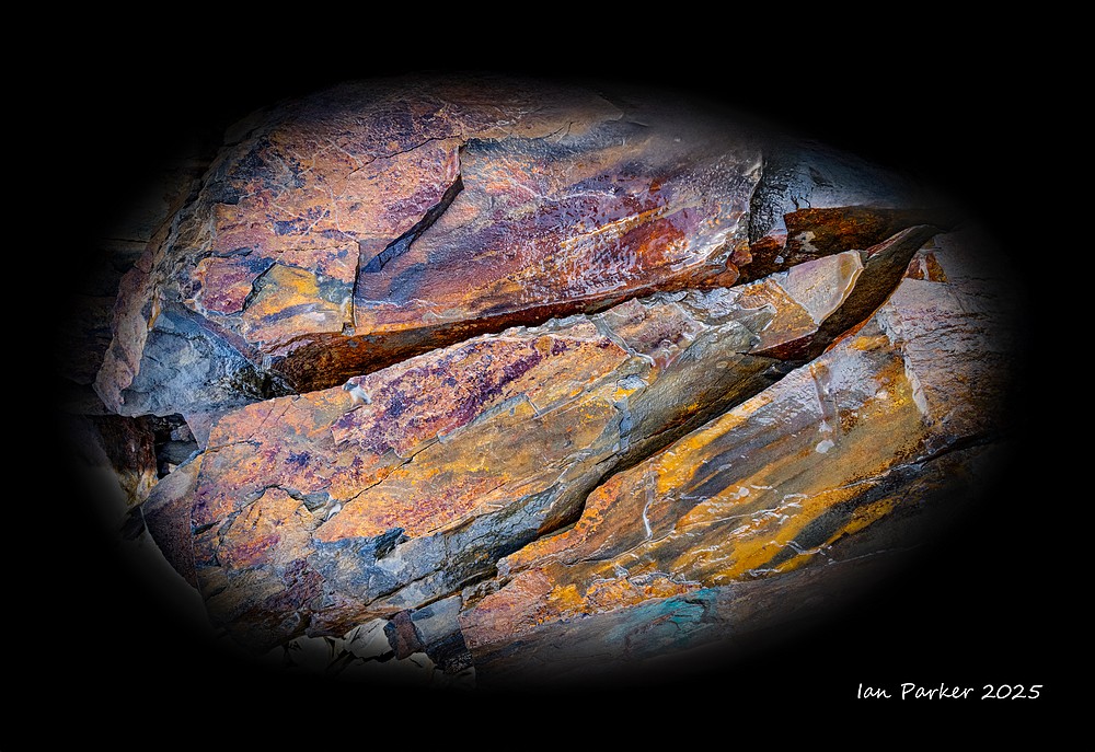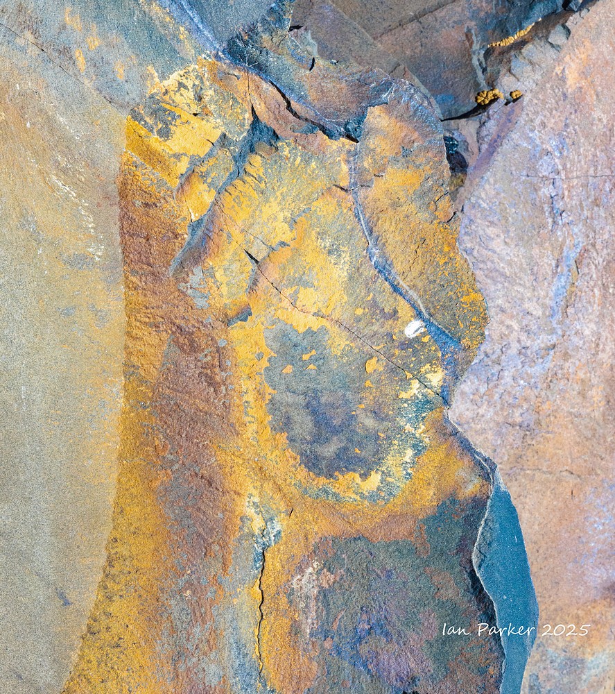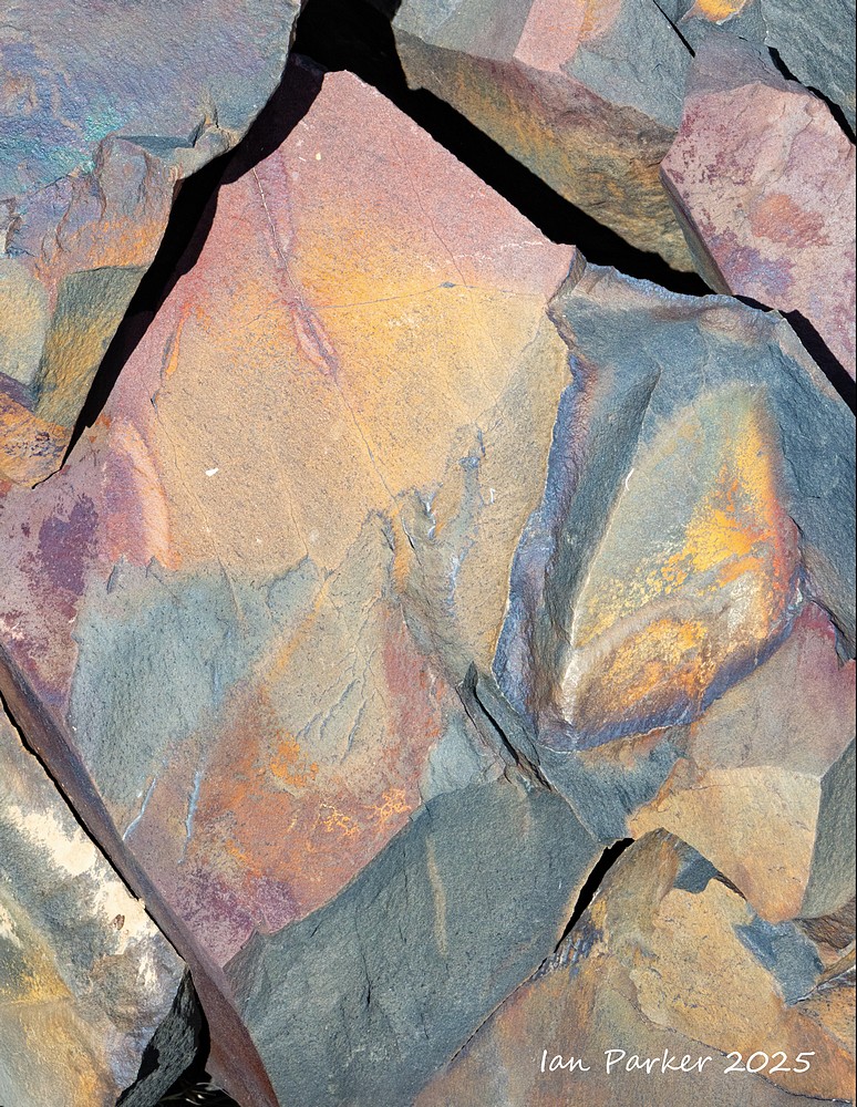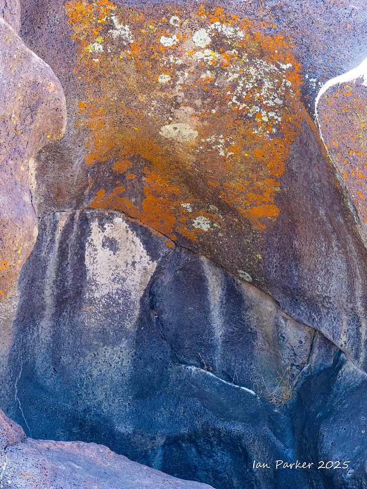 Even in their natural state many of the obsidian boulders at the base of the dome appeared polished and highly reflective, glinting brightly in the sunlight. The sun reflections were too bright and contrasty to photograph, so I crouched down and sought out polished areas on the shaded side of the boulders. There, the obsidian reflected the blue sky in wonderfully varied patterns, determined by the topography the glass surface as it cooled. Unexpectedly, I could also see patches of red interleaved among the blue! Fortuitously, I happened to be wearing a red T shirt that day which, catching the sunlight, threw a bright illumination on the obsidian. The interleaved patterns of red and blue reflections changed kaleidoscopically as I altered my viewpoint, and as I moved to reposition the light source from my T shirt.