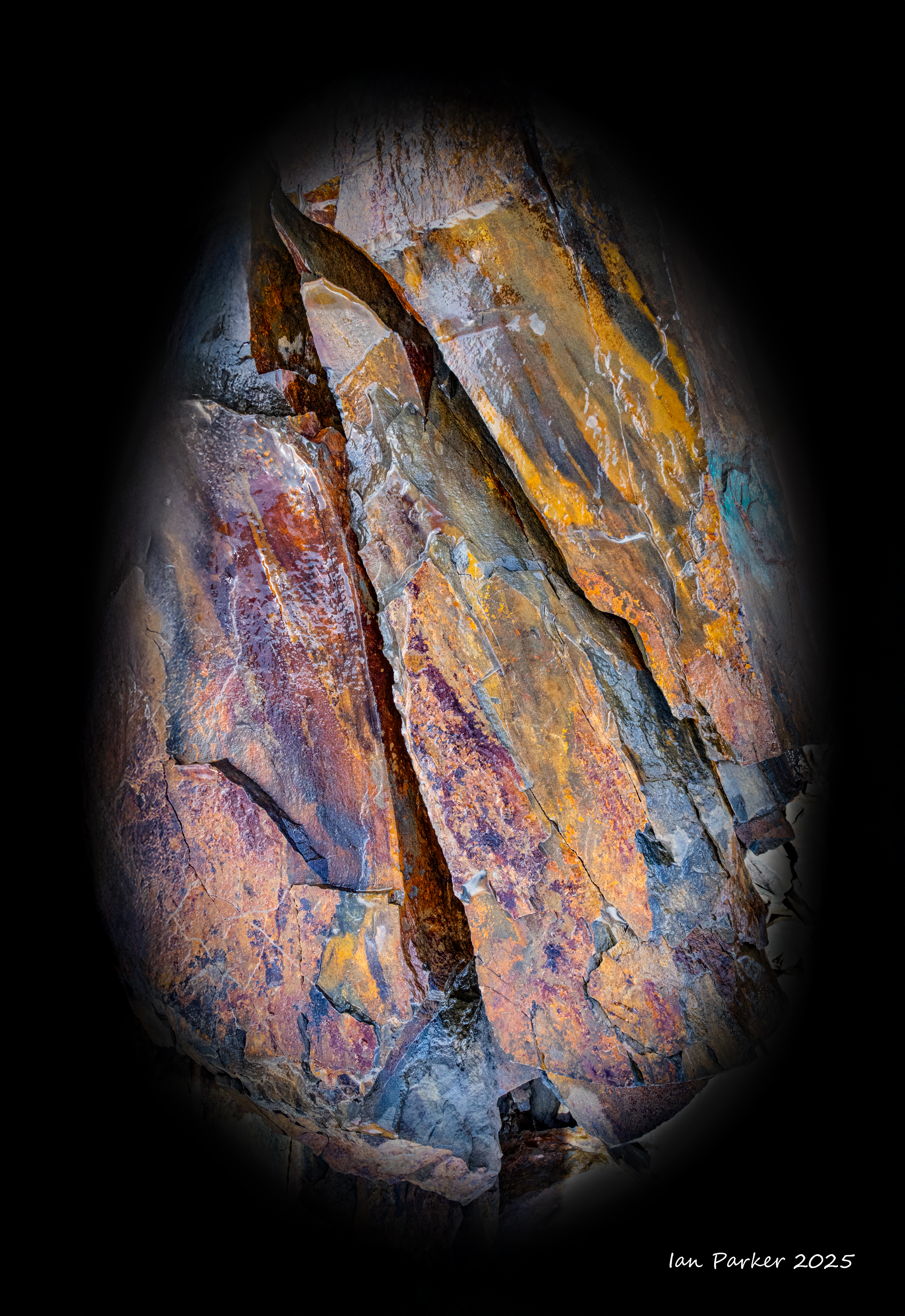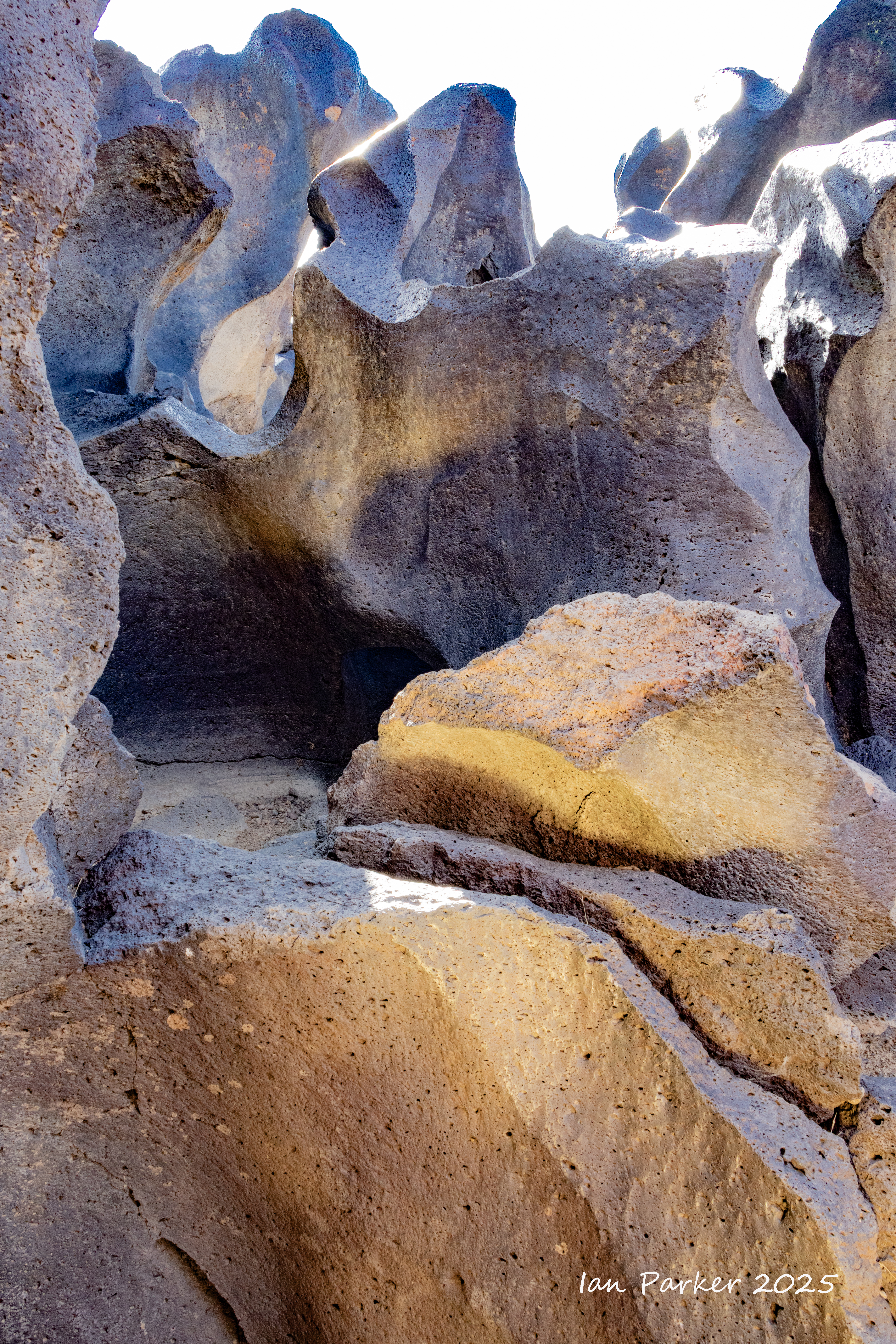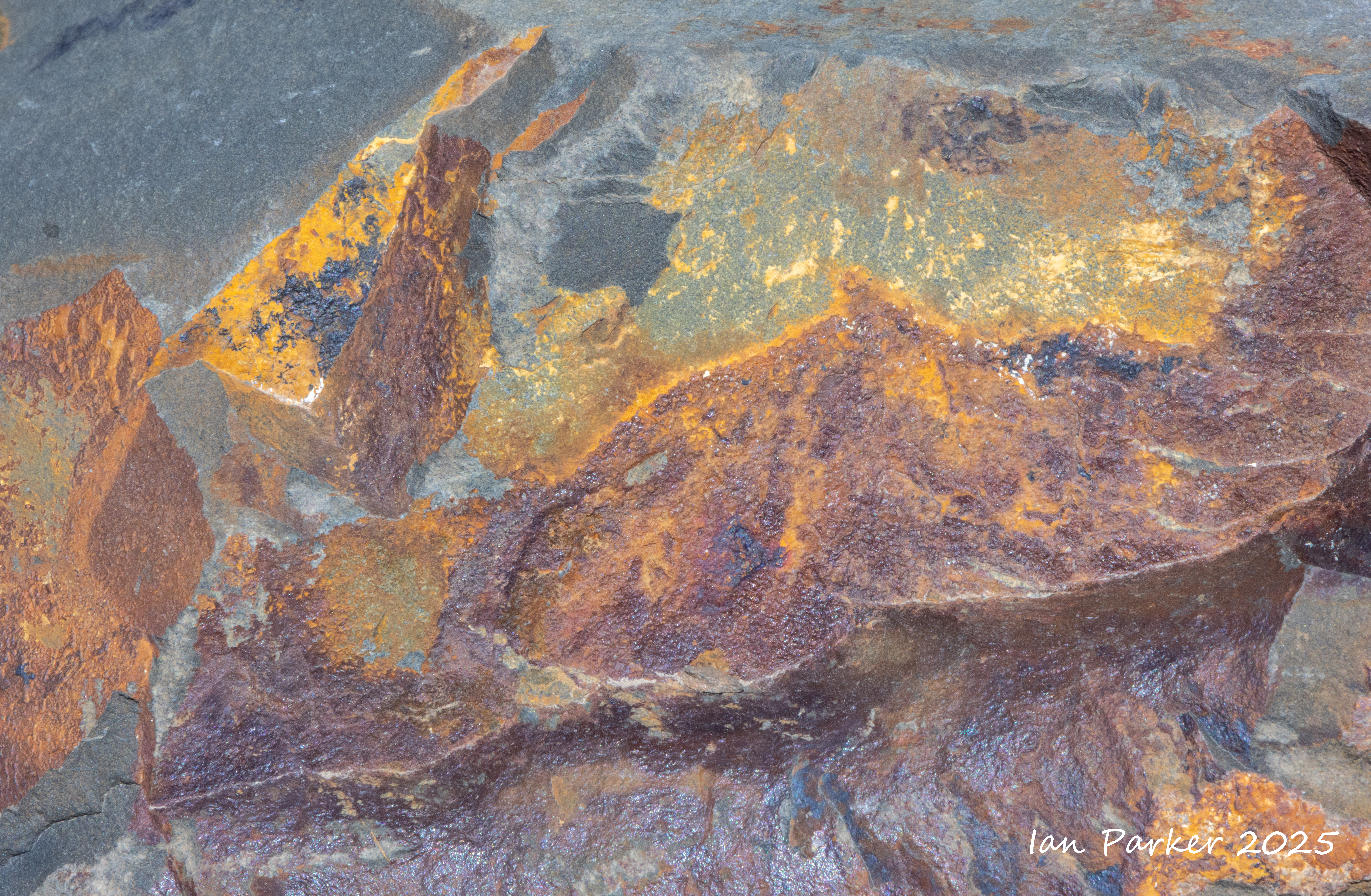 Even in their natural state many of the obsidian boulders at the base of the dome appeared polished and highly reflective, glinting brightly in the sunlight. The sun reflections were too bright and contrasty to photograph, so I crouched down and sought out polished areas on the shaded side of the boulders. There, the obsidian reflected the blue sky in wonderfully varied patterns, determined by the topography the glass surface as it cooled. Unexpectedly, I could also see patches of red interleaved among the blue! Fortuitously, I happened to be wearing a red T shirt that day which, catching the sunlight, threw a bright illumination on the obsidian. The interleaved patterns of red and blue reflections changed kaleidoscopically as I altered my viewpoint, and as I moved to reposition the light source from my T shirt.